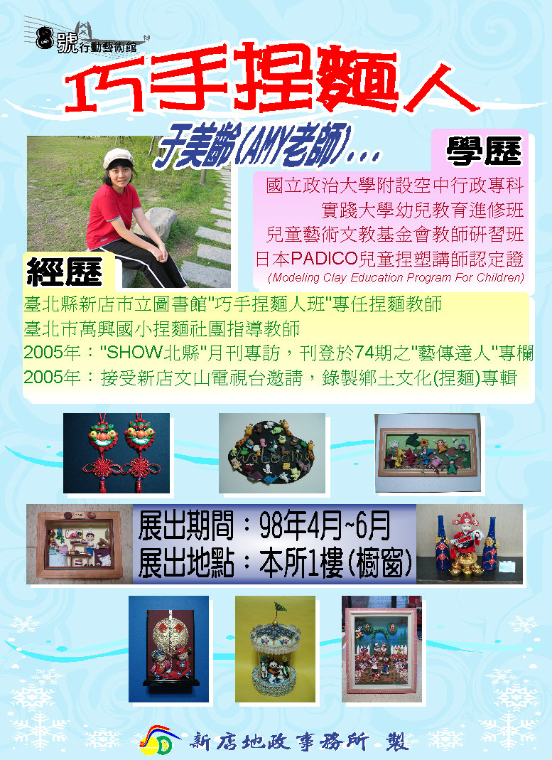 展覽時間: 98年4月1日至98年6月30日 展覽介紹: 攝影展(2007-2008 美麗新店攝影展) 本次展出美麗新店攝影作品37幅,藉此將新店地區得天獨厚的自然及人文資源與優美景觀,透過攝影師的鏡頭,作最完美的呈現,包括自然景觀、人文風采等,每一幅作品都詳實紀錄著新店的藝文美景。 捏塑展(捏麵巧藝.繽紛綺麗) 首次推展于美齡老師生動活潑的創意捏塑及多樣有趣的紙雕藝術作品,個個都令人驚喜連連,驚奇萬分!